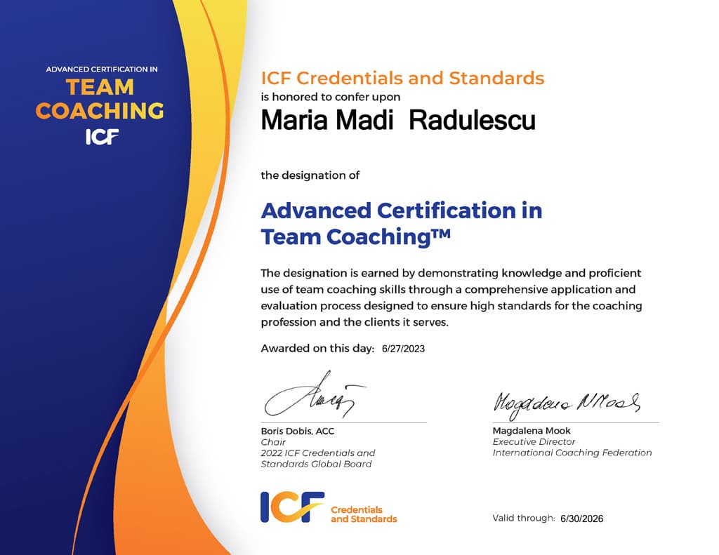 ACTC (Acdvanced Certification in Team coaching) este un moment important în cariera mea de coach care aduce recunoaștere angajamentului meu față de codul de etică și ridicatele standarde profesionale ale ICF și reflectă dorința mea continuă de dezvoltare și creștere profesională, în beneficiul clienților mei.